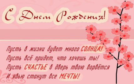 Поздравляю с Днём рождения! Желаю тебе хорошего настроения, огромного счастья, бесконечной любви, достатка в семье, карьерного роста, хороших друзей и, конечно же, здоровья тебе и всем, кто тебе дорог. Пусть мечты никогда не покидают тебя и превращаются в реальность.
