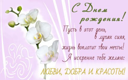 Поздравляю тебя с днём рождения! Желаю не болеть, не грустить, много улыбаться, сиять от счастья, с годами только хорошеть, верить в лучшее и в мечту, которая, несомненно, сбудется. Пусть удача будет твоим путеводителем, перед тобой открываются золотые горы благополучия и сладких грёз. Волшебные моменты пусть озаряют твой взгляд, любовь всегда будет рядом и доставляет тебе только удовольствие!