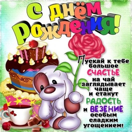 Поздравляю с днем рождения! В этот прекрасный день желаю, чтобы сказочная птица счастья принесла на своем хвосте удачу, огромный запас здоровья, сил и энергии, хорошее настроение и все жизненные блага. Пусть все изменения, которые происходят в жизни, будут только к лучшему! Пусть каждый день приносит новые и радостные открытия, а окружающие люди будут всегда добрыми и отзывчивыми.
