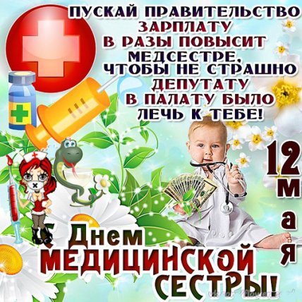 Дорогие наши феи в беленьких халатах! Поздравляем вас с праздником. И желаем, чтобы дежурство пролетало легко, работа всегда была в радость, а жизнь и отдых всегда были в удовольствие. Желаем достойных зарплат и премий, только покладистых пациентов, чуткого руководства и больших премий. С днем медицинской сестры!