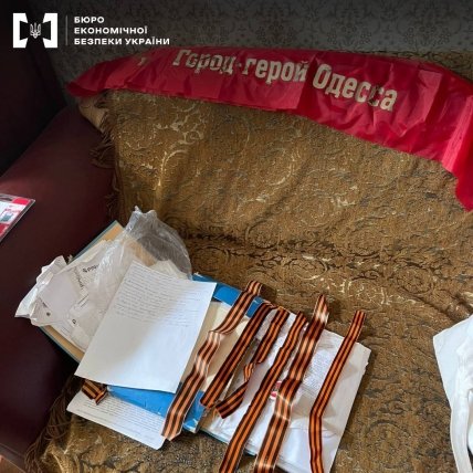 На днях Бюро экономической безопасности (БЭБ) Украины провело обыск у главы одного из банков Одессы, в ходе которого была найдена пророссийская символика в виде георгиевских лент, печатных пропагандистских материалов, наклеек, открыток с запрещенной символикой коммунистического тоталитарного режима. Глава финучреждения получила подозрение в уклонении от уплаты налога на добавленную стоимость на сумму 102 миллиона гривен.