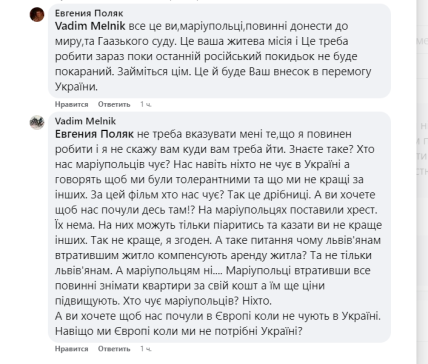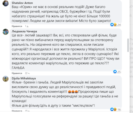 — Это очень интересный момент: кто виноват, Мариуполь или россия? — задает резонный вопрос глава Мариупольской ассоциации женщин "Берегиня" Марина Пугачева, которая помогала выбираться из окруженного города местным жителям и сейчас помогает украинцам находить убежище в Польше. — Будем ли мы повторять российские нарративы? Знаете, для меня этот фильм вариант москальской пропаганды. Объясняю почему. Можно взять какие-то реальные факты, добавить туда ложь и это сработает в пользу врага. Вот смотрите, реальные факты — это массовые убийства людей, это то, что вывозили людей в Россию принудительно об этом говорится в фильме. Но не было никакого хлеба, света и эвакуационных автобусов от ОБСЕ тоже НЕ БЫЛО! Вот все ложь! Но вместе получается некий "лайтовый" вариант того, что мы пережили в Мариуполе. Кроме того, что это травмирует жителей города, это искажает представление в мире о войне, потому что фильм транслируется за границей. И россия может говорить: да, люди умирали, да, шла война, но это было не так уж страшно!