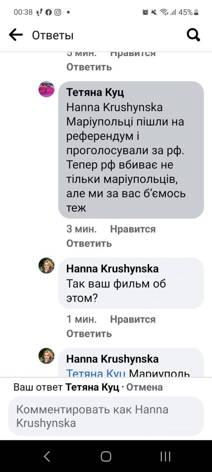 Несмотря на то, что скандал вокруг фильма с каждым днем усиливался, OsnovaFilm долго держал паузу. И единственной обратной связью был неожиданный комментарий одной из продюсерок Татьяны Куц в ленте жительницы Мариуполя Анны Крищинской : "Мариупольцы пошли на референдум и проголосовали за РФ. Теперь Россия убивает не только мариупольцев, но мы за вас бьемся тоже". Женщина в соцсети возмутилась таким обвинением, отмечая, как можно пытаться рассказать историю мариупольцев и при этом закрывать им рты и прибегать к клевете на них. Земляки поддерживают это мнение и считают, что с такой позицией точно не стоило браться за чувствительную тему.