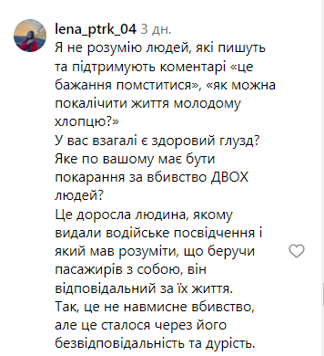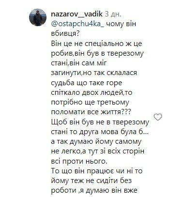 — Это взрослый человек, которому выдали водительское удостоверение и должен был понимать, что беря пассажиров с собой, он ответственен за их жизнь. Да, это не намеренное убийство, но это произошло из-за его безответственности и глупости. Да, это может произойти с каждым, но какую совесть нужно иметь, чтобы снова сесть за руль и дальше продолжить работу в такси. Он должен быть наказан хотя бы за это, – отметил один из комментаторов.