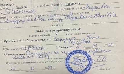 ДТП на трассе Киев — Чоп в селе Федоровка Ровенской области произошло утром 24 января 2023 года. Volkswagen Passat под управлением 19-летнего Никиты Кукурики на скорости снес металлическое ограждение и опрокинулся. Сам водитель отделался испугом, а его пассажиры — погибли: спавшая на заднем сиденье девушка сразу, а мужчина, находившийся на переднем пассажирском месте, умер позже в больнице.