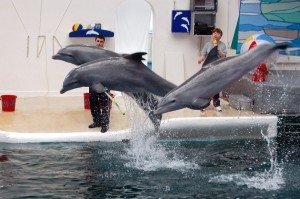 Детишки будут в восторге от интересной программы с участием дельфинов и акробатов. Дельфины плавают, прыгают, показывают трюки, танцуют и даже играют мячом. А еще к ним подносят микрофон и дельфины поют. Вся часовая программа сопровождается музыкальным шоу и веселым смехом.