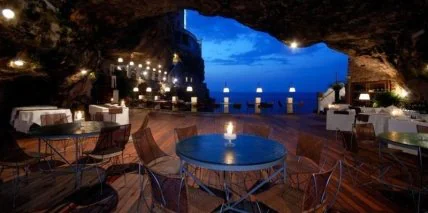 Очаровательный ресторан в Полиньяно-а-Маре в Южной Италии был построен в пещере, образовавшейся сотни лет назад, и является одним из самых уникальных заведений такого рода в мире. Пещера образована в известняковых скалах и находится на высоте 25 метров над уровнем моря, поэтому посетители ресторана могут наблюдать, как волны плещутся прямо под ними.
