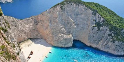 Располагается это замечательное место на на северо-западном берегу греческого острова Закинф, недалеко от небольшого городка Anafotiria. Песчаный пляж острова известен не только благодаря белому песку, голубой воде и окружающим его скалам, но прежде всего - кораблекрушению. Старое грузовое судно "Панайотис" уже многие годы ржавеет на нем, привлекая толпы туристов со всего мира. Считается, что судно когда-то принадлежало контрабандистам, которые бросили его после того, как не смогли починить. Благодаря нему у бухты есть еще одно название — "Бухта контрабандистов". Единственная возможность добраться до этого пляжа пролегает по воде, также некоторым удается взглянуть на него сверху с ближайшей горы.