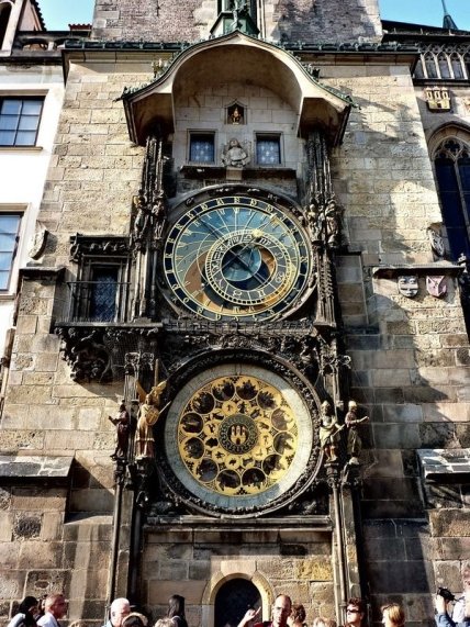 Часы, созданные в начале XV века, имеют не только обычный циферблат, но еще и астрономический, показывающий положение Солнца, Луны, Полярной звезды и некоторых созвездий. Ежечасно с 8-и утра до 8-и вечера под бой курантов над часами развертывается целое представление с участием фигуры Смерти, 12-и апостолов, символического изображения человеческой скупости и тщеславия, а также фигурки турка – символа угрозы, исходящей от Османской империи.