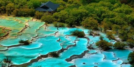 Хуанлун (с кит. "Жёлтый дракон") - живописный заповедный район на северо-западе провинции Сычуань в Китае, лежащий в 150 километрах к северо-западу от города Чэнду. Расположена природная достопримечательность на высоте более 3000 метров над уровнем моря в южной части горного хребта Миньшань. Данная местность славится богатством лесной экосистемы, снежными вершинами, водопадами и горячими источниками, однако главная гордость заповедника – образованные из известнякового туфа травертиновые террасы с разнокалиберными озерами, которые украшают одноименную долину Хуанлун. Кроме того, заповедная зона служит домом для многих исчезающих видов, включая золотистую курносую обезьяну и гигантскую панду. В 1992 году Хуанлун присоединился к списку объектов Всемирного наследия.