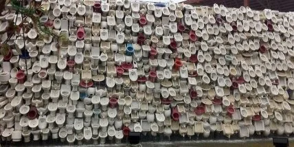В одной из китайских провинций есть город Фошань. Там находится один из самых странных экземпляров современного стрит-арт искусства - водопад из 10,000 туалетов, раковин и писсуаров. Вся экспозиция занимает огромную стену, 100 метров длиной и 5 метров высотой. Этот водопад первоначально был разработан для фестиваля керамики и фарфора, который проходил в Фошань в 2009 году. Однако затем это своеобразное произведение искусства стало частью местного ландшафта. Это лишь одна из многих впечатляющих керамических скульптур в городском парке. Создатель этого творения - китайский художник Шу Юн. Он и его команда провели два месяца, устанавливая все детали на стене. Туалеты собирали, как говорится, всем миром. Часть из них - заводские браки, а другая часть подарены иностранцами и местными жителями. Вода льется не всегда, однако все подключено к кранам и периодически создает каскадный водопад на потеху зрителей.