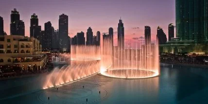 Этот светомузыкальный фонтан на сегодняшний день считается самым большим в мире. Расположен он в центре даунтауна Дубая аккурат между самым большим в мире торговым моллом - Моллом оф Эмирейтс и самым высоким в мире же зданием - небоскребом Бурж Халифа. Оба объекта здесь видны на всех фотографиях - краешек молла находится на левом, а основание Бурж Халифы - на правом краю всех карточек, здесь видны ее первые 15-25 метров, над которыми (уже вне поля обзора фотографий) громоздятся ввысь еще что-то около 800 метров здания. Создатель этого фонтана - тот же инженер, что построил музыкальный фонтан в Лас-Вегасе, рядом с гостиницей Белладжио. Честно говоря, слишком сильно при этом он явно не перенапрягся — оба световых шоу выглядят как близнецы-братья. На нижнем снимке — фрагмент светомузыкального представления в Лас-Вегасе, я его снял аж в 2008 году. Самое главное различие между ними, пожалуй, лишь в количестве задействованных водяных пушек, да в том, что в Дубае шоу длится около 3 минут и повторяется каждые полчаса (вернее, каждые полчаса происходит новое, отличное от предыдущих выступление, со все более сложным и впечатляющим сюжетом) с момента заката и до 12 часов ночи. В Белладжио представление происходит в рядовые дни один раз за вечер: