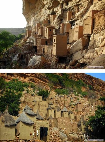 Склон Бандиагара состоит из ландшафта скал и песчаных плато, а также потрясающей архитектуры, которая включает в себя зернохранилища, святилища, дома и общие места встреч, известные как Тогу На. Построенная в скалах жителями Западной Африки, деревня считается одним из самых впечатляющих мест региона.