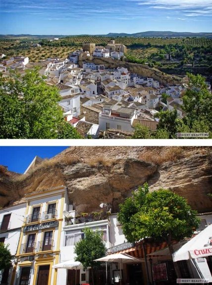 Расположенный недалеко от Андалусии, впечатляющий скалистый город Испании Ронда, Сетениль-де-лас-Бодегас, - это небольшая деревня, построенная под нависающим массивным утесом. Здесь многие жители буквально живут под скалой, в пещероподобных сооружениях, которые были встроены в ущелье.