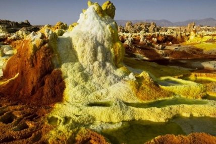Даллол - это название спящего вулкана, а также расположенного рядом заброшенного селения в Эфиопии. Вулкан Даллол и его окрестности известны как самое жаркое место на Земле, так как в период с 1960 по 1966 годы здесь был установлен абсолютный рекорд среднегодовой температуры (+34 ºC). А еще это место выглядит абсолютно инопланетным благодаря застывшим кристаллам калийных солей, железа, марганца, вымытых на поверхность горячими источниками.