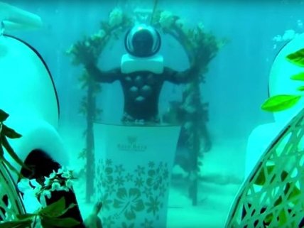 Если ваше представление о романтике вмещает в себя шлем для подводного погружения, отправляйтесь на юг Тихого океана, чтобы пожениться в подводной часовне. Пары могут нарядиться в белые гидрокостюмы. На дне голубой лагуны их встретит подводный полинезийский священник, который и проведет свадебную церемонию. На глубине около 4 метров под водой жених и невеста могут произнести клятвы верности, обменяться кольцами, подписать свидетельство о браке и запечатлеть все это с помощью подводного оператора. Можно даже пригласить до четырех друзей, чтобы они стали свидетелями этого волшебного момента. В США можно пожениться под водой в океанариуме Long Island Aquarium в окружении самых настоящих акул.