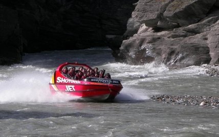 А в новозеландском городе Квинстауне самым популярным аттракционом является скоростной проход на катере по узкой и опасной горной реке. Каменистое дно, пороги, резкие повороты, нависающие скалы и мелководье (на некоторых участках маршрута глубина не превышает 10 сантиметров) — всё это усиливает ощущения от экстремального аттракциона "Шотовер Джет". Добавляет напряженности вертолет, с высоты контролирующий успешность прохождения маршрута. Финальную точку водитель катера ставит в конце маршрута, резко разворачивая катер на 360 градусов.