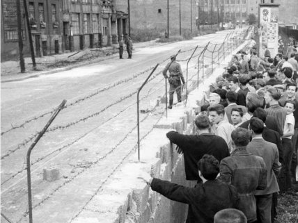 Жители Западного Берлина осматривают вновь возведенную стену на границе с советской частью города, 27 августа 1961 года.
