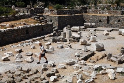 Человек идет по развалинам мавзолея в Галикарнасе, одного из Семи Чудес Древнего мира.