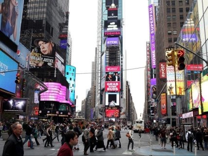 Туристы стекаются на Таймс-Сквер, чтобы увидеть яркие огни.