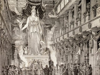 Художник запечатлел внутреннее убранство Парфенона вместе со статуей богини Афины.