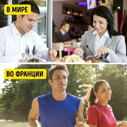 Во многих французских офисах, банках и госучреждениях обеденный перерыв длится не час, а 2. Дело в том, что к процессу принятия пищи в этой стране относятся серьезно — работодатели заботятся о том, чтобы сотрудники могли успеть съездить домой и не спеша пообедать. При этом многие любители ЗОЖ предпочитают использовать столь долгий перерыв для того, чтобы побегать в ближайшем парке или сквере.