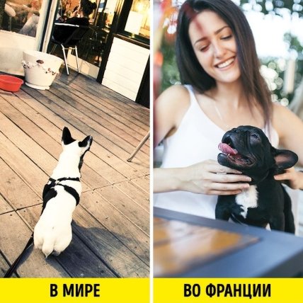 Французы обожают собак, поэтому весьма лояльно относятся к нахождению питомцев в кафе и даже ресторанах. Так что если вы путешествуете с четвероногим другом, то можете смело рассчитывать на дружелюбие и гостеприимство французов.