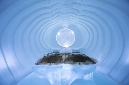 По своему внешнему виду этот отель напоминает очень холодную арт-инсталляцию. Жилые апартаменты доступны туристам только один сезон в году, так как каждую зиму отель приходится отстраивать заново. Отдыхающие могут заночевать и в "теплых номерах", а также развлечься "самостоятельным сооружением ледяных избушек" или отправиться на экскурсию с интригующим названием "ледовое творчество под полуночным солнцем".