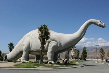 Динозавры Claude’a Bella в Cabazon в Калифорнии — это 150-тонное здание в виде апатозавра (на фото) и 100-тонная скульптура тиранозавра.