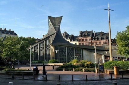 Храм расположен на площади Вье-Марше. В XVI веке на его месте стоял готический собор, от которого остались только витражи. Церковь Святой Жанны построена в современной манере с использованием асимметричных архитектурных форм и интересных инженерных решений. Крыша конструкции символизирует языки пламени, в котором погибла Жанна. В комплекс церковных зданий также входит крытый рынок.