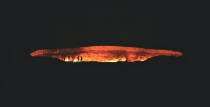 Чтобы вредные газы не выходили наружу, в 1971 году геологи подожгли наполненную газом пустоту, образовавшуюся в ходе разведки скопления подземного газа, полагая, что через пару дней огонь погаснет. Но пламя с тех пор так и не потухло, непрерывно горя днем и ночью. Местные жители и путешественники прозвали место "Дверью в преисподнюю".