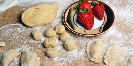 3. Лепим вареники. От теста отрезать небольшой кусок. На доске, присыпанной мукой, скатать из него колбаску, разрезать на небольшие кусочки. Каждый кусочек раскатать так, чтобы получился плоский кружочек. На середину каждого из них уложить несколько ягод клубники, сверху насыпать немного сахара (примерно 1 ч. ложку) и залепить вареник. И так пока не закончится тесто.