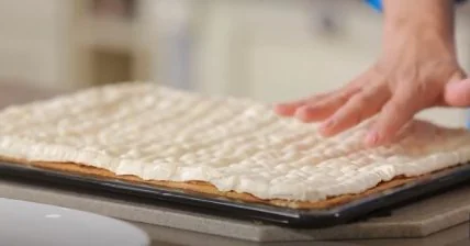 - Тонко раскатайте ваше тесто по размеру противня и аккуратно выложите его.