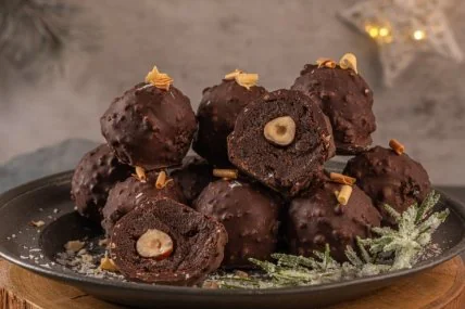- С помощью столовой ложки скатайте смесь в шарики и в каждый вдавите один фундук.