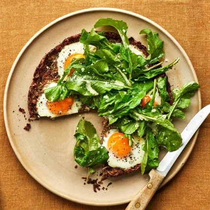 Решти выкладываются на тарелку, сверху – жареные яйца (перепелиные – на каждую оладью, куриные – поверх двух). Они посыпаются зеленью и сразу подаются. Хорошо будет пользоваться такими ароматными оладьями соус на основе сметаны.