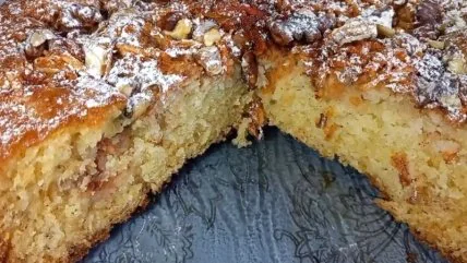 - Посыпаем молотой корицей, измельченными орешками и выпекаем 35 минут при 180 градусах.
