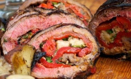 Свернуть из мяса рулет стороны. Через каждых 4-6 см скрепить рулет кулинарной нитью. Жарить стейк на гриле, часто переворачивая, до желаемой степени готовности. Переложить готовый стейк на разделочную доску, накрыть фольгой и оставить на 10 минут. Удалить кулинарную нить, нарезать мясо ломтиками и подавать.