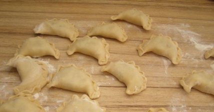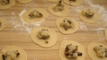 Раскатать "шайбочки" до толщины 1,5 мм. Выложить начинку. Залепить края, формируя вареники.