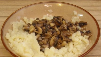 Рецепт дня: творожная запеканка с киви и бананамиКартофель отварить в мундирах. Очистить. Добавить 1 ст. ложку растительного масла и размять. Добавить грибы. Перемешать.