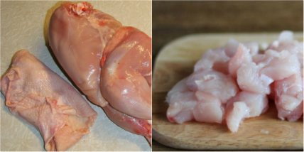 1.Снимите кожу с курицы, отделите мясо от костей и нарежьте кусочками средней величины. Если кусочки курицы немного отбить, рулет будет невероятно мягкий и нежный.