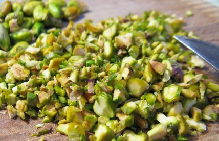 3. Очистите фисташки от скорлупы, мелко порежьте и смешайте с грибами и курицей. Добавьте соль, перец и приправы по вкусу.