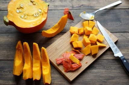 1. Взять тыкву среднего размера, помыть и очистить от  кожуры. Нарезать небольшими кубиками, побрызгать небольшим количеством оливкового масла, посолить и поперчить. Поставить тыкву в предварительно разогретую до 200 градусов духовку на 20 минут.