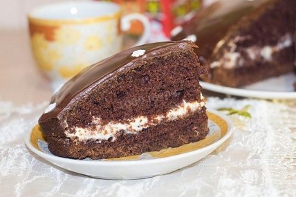 Приготовленный шоколадный бисквит разделить на 2 или 3 коржа, смазать их теплым кремом. Украсить вкусный сумасшедший пирог "Crazy Cake" по своему усмотрению.