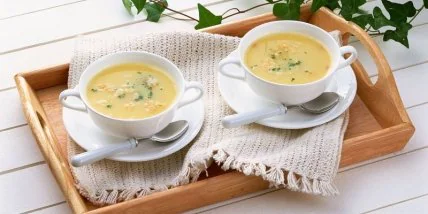 Чтобы французский сырный суп был еще вкуснее, советуем вам нарезать кубиками багет и подсушить его в духовке, а затем бросить эти домашние сухарики в тарелку.