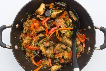 Превосходное сочетание баклажанов с перцем, морковью и луком, обжаренных в масле с пряными травами, создаёт неповторимых аромат и незабываемый вкус.