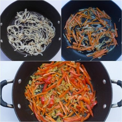 5. Нагрейте 3 столовые ложки растительного масла в сковороде, добавьте лук и поджарьте его до золотистого цвета на среднем огне. После этого добавьте морковь и жарьте 3 минуты. Последовательно добавьте болгарский и красный сладкий перцы и протушите всё вместе в течение 5-7 минут. Затем отправьте в сковороду помидоры, черный перец, сахар и чеснок и тушите 1 минуту. Уберите сковороду с огня и отставьте в сторону.