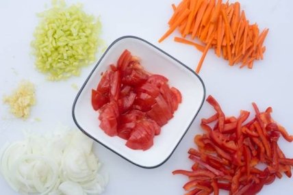 4. Пока баклажаны запекаются, подготовьте овощи: нарежьте лук тонкими полукольцами; морковь порежьте соломкой; болгарский перец нарежьте мелко, а сладкий красный перец порежьте тонкими полосками; помидоры нарежьте средними кусочками и выдавите чеснок.