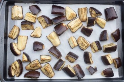 3. Слейте образовавшийся сок от баклажанов, а затем полейте баклажаны 2 столовыми ложками растительного масла, снова посолите (1,5 чайной ложки) и тщательно перемешайте. После этого выложите баклажаны на противне и поставьте в духовку на 30 минут.
