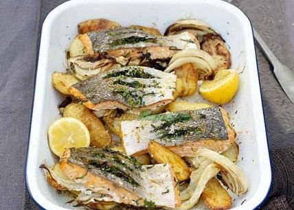 Состав продуктов для лосося с картофелем, запеченного в духовке: