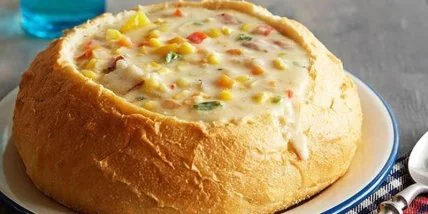 В съедобной тарелке из хлеба можно подать на стол не только чаудер, но и любой другой густой суп.